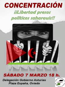 El próximo sábado 7 de marzo, a las 18 horas, realizaremos una concentración para apoyar a los presos políticos, exigir el respeto de los Derechos Humanos y el cumplimiento de la Legalidad Internacional en el Sáhara Occidental. La convocatoria es frente a la Delegación del Gobierno en Asturias, en la Plaza de España, Oviedo.