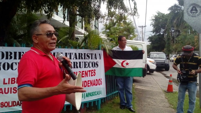 Panamá,29 de julio de 2017(SPS)-. La asociación panameña de solidaridad con la causa Saharaui se manifestó este viernes frente a la recién abierta embajada del Reino de Marruecos exigiendo la inmediata liberación de todos los presos políticos saharauis condenados injustamente por el genocida y militar gobierno marroquí.