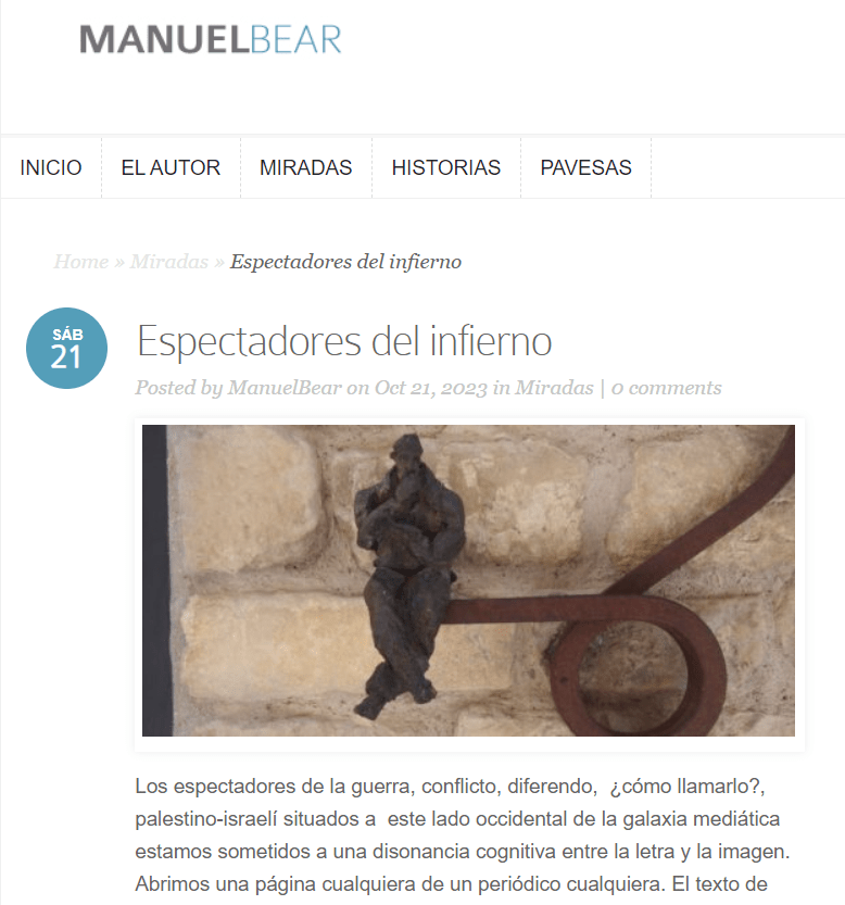 Los espectadores de la guerra, conflicto, diferendo, ¿cómo llamarlo?, palestino-israelí situados a este lado occidental de la galaxia mediática estamos sometidos a una disonancia cognitiva entre la letra y la imagen. Abrimos una página cualquiera de un periódico cualquiera. El texto de la información está presidido e impregnado por la firmísima condena del terrorismo palestino y el derecho de Israel a su propia defensa; los más avezados de entre los informantes nos descubren en el accionar palestino la mano negra de Irán o de Rusia, incluso de China, y si el lector se interna en ciertos vericuetos de este paisaje discursivo podrá llegar a creer que doña Yolanda Díaz es la inspiradora de Hamas y sus crímenes. Hasta aquí el texto, pero si la mirada del espectador se desplaza a la imagen que ilustra la crónica o la columna de opinión se encontrará indefectiblemente con un mensaje contradictorio. Todo el material gráfico disponible corresponde a escenas de devastación en las poblaciones palestinas: edificios en ruinas, caravanas de civiles expulsados de sus casas con rumbo a no se sabe dónde, niños ensangrentados en brazos de sus padres, jóvenes iracundos que portan el féretro de un compañero, abuelas rodeadas de su llorosa prole cuyos padres han muerto en un bombardeo, etcétera. Los israelíes que aparecen en estas imágenes representan siempre la fuerza: soldados armados como robocops, que vigilan el desastre con una mirada neutra y profesional.